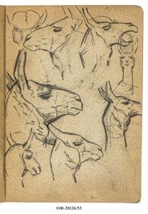 На листе вертикального формата - 8 набросков головы ламы в разных ракурсах. На обороте - 2 наброска сидящего желтоклювого токо в профиль влево и 2 зарисовки его головы. Рисунки птиц выполнены графитным и коричневым карандашами.