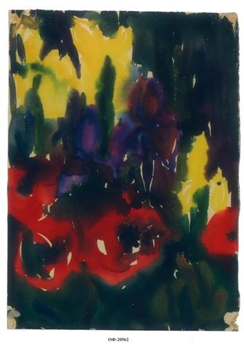 Композиция вертикального формата, изображены на темно-зеленом фоне желтые и фиолетовые ирисы, внизу - красные маки. Акварель написана по-сырому.
