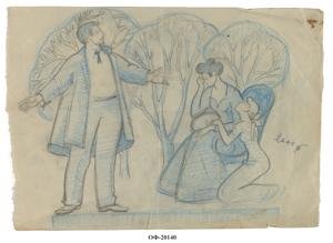 Композиция горизонтального формата, изображен эскиз к скульптуре "Вишневый сад": справа в кресле сидит женщина, приложившая руку к лицу, справа от нее на коленях стоит девушка. Слева стоит мужчина с разведенными в стороны руками. Сзади видны силуэты 3 деревьев. Внизу обозначен край плинта скульптуры.