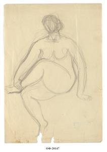 На листе вертикального формата - линейный набросок сидящей обнаженной, положившей левую ногу на колено правой ноги, и придерживающей левую лодыжку правой рукой.