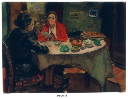 Композиция горизонтального формата, изображен интерьер квартиры с накрытым круглым чайным столом, за которым две женщины играют в карты. Слева сидит правым боком к зрителю на стуле с высокой спинкой женщина в черном платье с длинными рукавами. Напротив, за столом изображена в фас женщина в красной кофте с белым отложным воротником, держащая в правой руке веер из карт. Стены зеленые, справа изображен темно-коричневый шкаф.