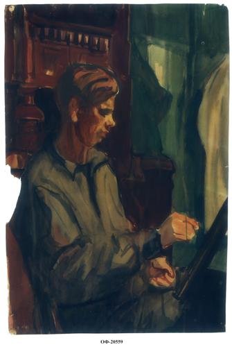На листе вертикального формата изображен профильный поясной портрет молодого человека, сидящего перед планшетом. Художник одет в серую рубашку. На заднем плане слева виден резной деревянный буфет.