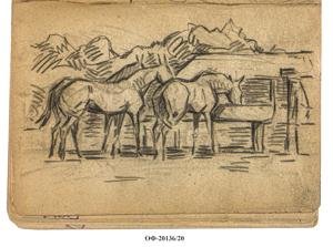 На листе вертикального формата расположены 6 линейных набросков лошадей в разных позах. На обороте - зарисовка группы из трех лошадей у кормушки в загоне. На втором плане справа виднеется некое строение, а далее - купы деревьев.