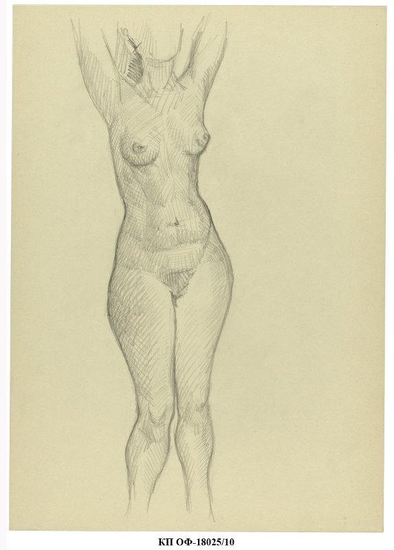 Стоящая обнаженная с поднятыми вверх руками. Рисунок