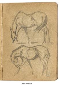 На листе вертикального формата - два наброска лошадей в профиль влево. Вверху изображена пасущаяся лошадь, опустившая вниз голову. Внизу - идущая лошадь с опущенной вниз головой. На обороте - линейный незаконченный набросок лошади в профиль влево.
