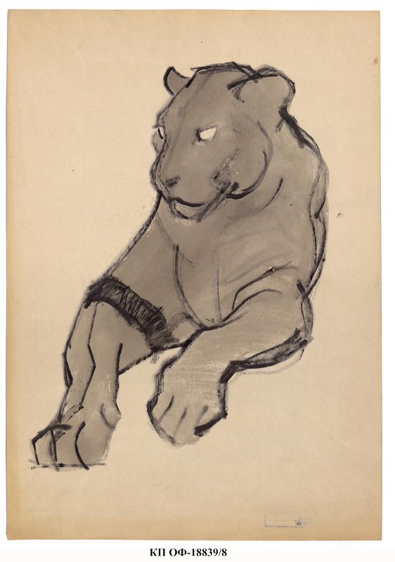 На листе вертикального формата изображена лежащая с поднятой вверх головой львица, вытянувшая вперед лапы. Голова повернута в три четверти налево, правая передняя лапа вытянута вперед дальше левой, на правой передней лапе - черная поперечная полоса (повязка?). Контур нарисован черным фломастером, внутри залит серой акварелью. Глаза не прорисованы, оставлены белыми.