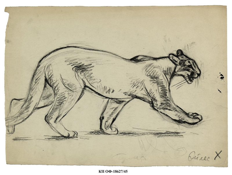 На листе горизонтального формата изображена идущая слева направо пума. Голова повернута в профиль, пасть приоткрыта. Правая передняя лапа вынесена вперед, не касаясь земли; левая задняя - отставлена назад. Хвост опущен вниз. По акту №8-ВХ от 23.04.2012 данная работа была записана как «Львица идущая», но изображена пума.