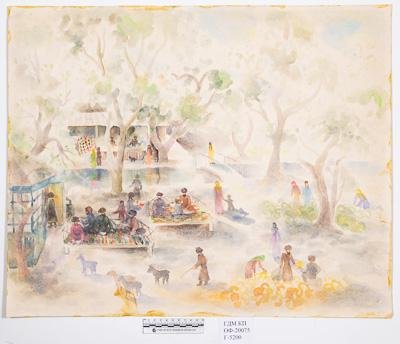 Композиция горизонтального формата, изображен пейзаж поселка Гиждуван в Бухарской области Узбекистана. На первом плане слева изображен пастух и 4 козы, а справа - продавец дынь с двумя покупателями. В центре изображена чайхана, где под открытым небом на двух прямоугольных топчанах, застеленных пестрыми коврами, сидят посетители-мужчины в традиционной узбекской одежде и пьют чай и едят. Справа под деревом виден развал, где продают арбузы. На третьем плане виден водоем с мостиком, на котором стоит девушка в желтом платье, слева видна лавка, где продают ткани или ковры.