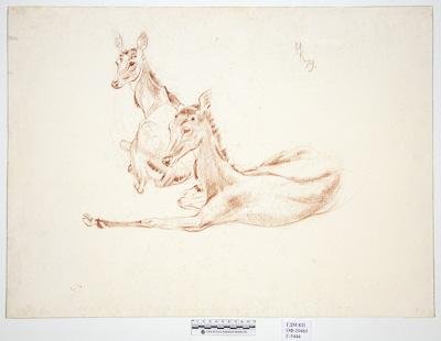 На листе горизонтального формата изображены две лежащие молодые антилопы нильгау с маленькими, только начавшими пробиваться рожками.