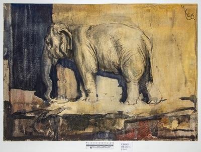 На листе горизонтального формата изображен в профиль влево стоящий у стены в вольере индийский слон с опущенным вниз хоботом. Основная колористическая гамма теплая, тени холодные.