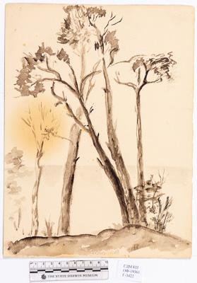 Композиция вертикального формата, гризайль. Изображены 5 лиственных деревьев на берегу некого водоема. Линия горизонта расположена ниже середины.