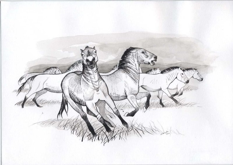На листе горизонтального формата изображен скачущий табун из 8 лошадей Пржевальского. На первом плане слева изображена в фас скачущая на зрителя лошадь. Все остальные лошади изображены в профиль направо. Небо и трава слегка тонированы черной акварелью.