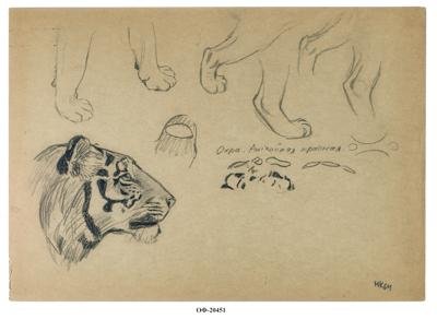 На листе горизонтального формата в левом нижнем углу расположена зарисовка головы тигра в профиль направо, рядом - набросок уха сзади. У верхнего края - 6 набросков лап в разных положениях. Справа посередине листа надпись: «Охра. Английская красная».