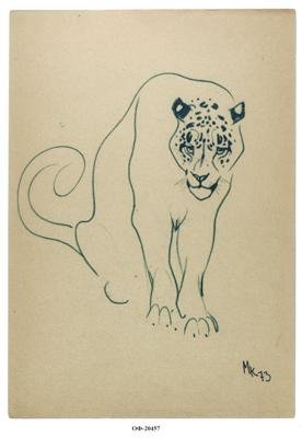 На листе вертикального формата изображен сидящий леопард. Голова несколько опущена и повернута в фас к зрителю, глаза открыты, уши повернуты назад. Хвост откинут налево и С-образно изогнут. Набросок линейный, прорисована с пятнами только голова.