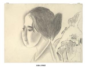 На листе горизонтального формата изображен портрет женский головной, в три четверти влево. Крупным планом изображена молодая кореянка с длинными волосами, собранными на затылке в пучок. Лицо округлое, с высоким лбом, тонкими бровями, полуприкрытыми глазами, взгляд направлен налево и вниз. На втором плане справа намечен пейзаж: высокий холм с редкими деревьями, посередине которого расположена пагода с высокой крышей.