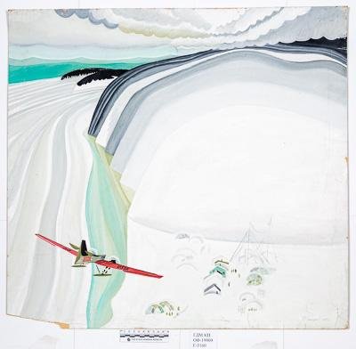 Композиция горизонтального формата, изображен высокий морской берег, покрытый снегом. Справа внизу виден поселок Уэлен - ряд деревянных домиков с двускатными крышами, рядом с которыми стоят полукруглые иглу. Справа вдали видны мачты радиосвязи. У домов видны маленькие фигурки людей. Слева внизу изображен летящий к поселку маленький самолет с красными крыльями, на которых надписи: "USSR". Линия горизонта расположены высоко, небо покрыто низкими кучевыми облаками.