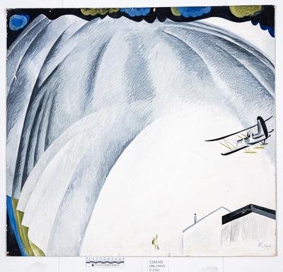 Композиция горизонтального формата, изображен высокий морской берег, покрытый снегом. Справа внизу виден поселок Уэлен - два деревянных домика с двускатными крышами. В центре внизу стоит человек, поднявший вверх правую руку. Справа вверху изображен летящий маленький самолет, в котором виден летчик с приветственно поднятой рукой.