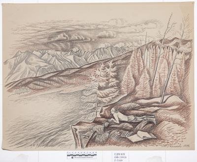 Композиция горизонтального формата, изображен речной пейзаж. На первом плане справа на берегу реки, поросшим низким хвойным лесом, лежит на животе, приподнявшись на локтях, человек. Слева от него на земле лежит раскрытый альбом и коробка с карандашами. Противоположный берег реки - сопки, покрытые тайгой, над которыми возвышается в отдалении горная гряда. Небо покрыто легкими облаками.