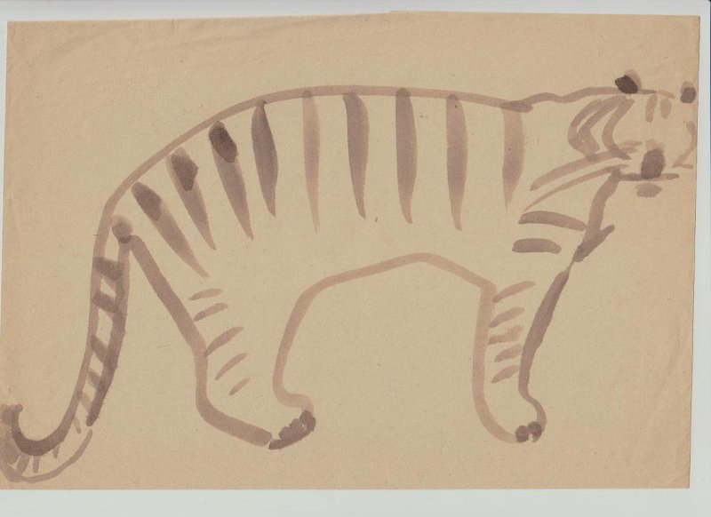 На листе горизонтального формата изображен стоящий тигр в профиль вправо. Голова повернута в фас. Рисунок обобщенный, линейный.