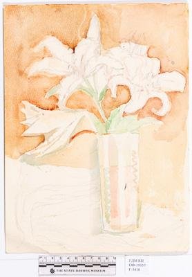 На листе вертикального формата изображен букет из трех белых лилий в высокой стеклянной вазе. Фон - рыжевато-коричневый. Нижняя часть листа не закрашена.