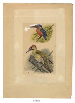 На листе вертикального формата изображены в профиль налево зимородок и зеленый дятел. Зимородок сидит на веточке камыша вверху, зеленый дятел сидит на обломанном стволе дерева. Под птицами написаны номера: «1» и «2».