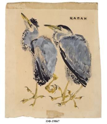 На листе вертикального формата изображены две стоящие цапли в профиль влево. У левой цапли клюв поднят вверх, одна лапа согнута и поджата. в правом верхнем углу наклеена бумажка с надписью «ЦАПЛИ».