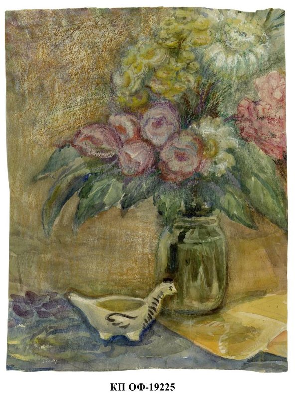Композиция вертикального формата, основная колористическая гамма теплая. Изображен букет из розовых, желтых и белых цветов в стеклянной банке. На переднем плане слева стоит керамический сосуд в виде белой птички на четырех ножках. Птичка стоит на синей драпировке, а банка с цветами на желтой салфетке. Фон - зеленовато-коричневый.