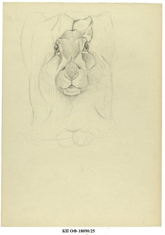 Лежащий заяц-русак. Набросок в фас. Рисунок