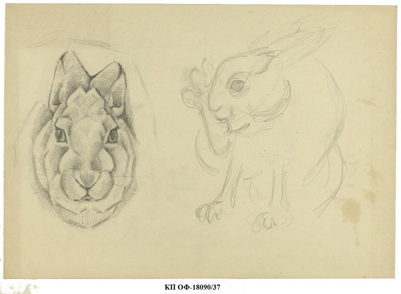 Зарисовка головы и набросок зайца-русака. Рисунок