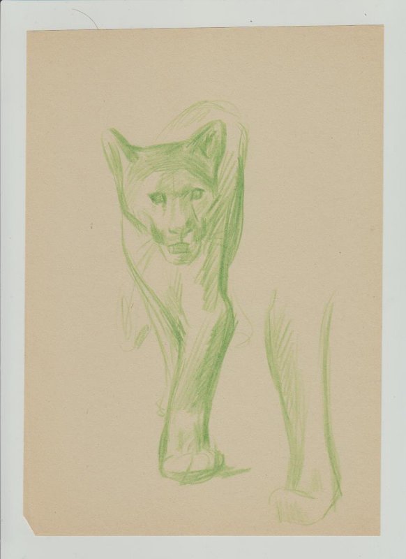 На листе вертикального формата в фас изображена идущая пума с чуть приоткрытой пастью. Животное движется, выставив вперед левую переднюю лапу. В правом нижнем углу - зарисовка передней лапы пумы.