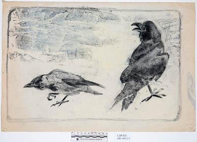 На листе горизонтального формата изображены серая ворона и ворон на снегу. Ворона стоит в профиль налево, голова вытянута вперед, правая лапка поджата. Ворон изображен справа в повороте в три-четверти со спины, голова поднята вверх и повернута налево, клюв открыт. Вдоль краев листа проведена рамка серой краской.