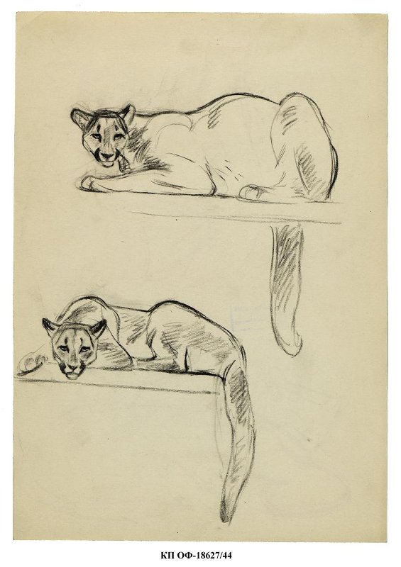 На листе вертикального формата - две зарисовки пумы, лежащей на полке. Наверху изображена в профиль налево пума, лежащая на полке. Голова поднята и повернута в фас в сторону зрителя. Лапы поджаты, хвост свисает вниз. Внизу изображена в профиль налево лежащая на полке пума, голова, повернутая в фас, лежит на передних лапах. Хвост свисает вниз. На обороте - 3 незаконченных наброска кошачьего хищника, выполненные красным карандашом. По акту №8-ВХ от 23.04.2012 данная работа была записана как «Две львицы лежащие на полках», но изображены пумы.