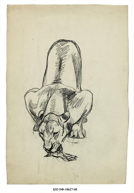 На листе вертикального формата изображена в фас спереди львица, поедающий мясо. Животное сидит, нагнувшись вниз к земле, на которой лежит еда. Голова повернута в три четверти налево, лапы поджаты.