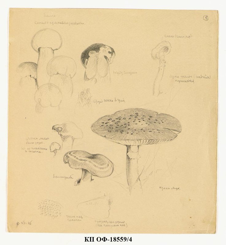 В левом верхнем углу изображены четыре белых гриба; справа от них - белый гриб, погрызенный слизнем; под ним - фрагмент структуры ножки белого гриба. Внизу слева - две ложные лисички, правее - волнушка. Справа внизу - большой мухомор; над ним - некий пластинчатый гриб на тонкой ножке.