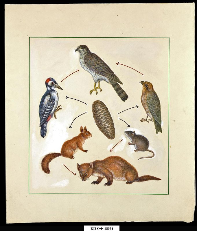 На листе вертикального формата в зеленой рамке изображены схематично пищевые цепи с еловой шишкой посередине. Вверху слева - большой пестрый дятел; вверху справа - клест. К ним от шишки идут черные стрелки. От птиц вверх идут красные стрелки; вверху в центре листа изображен ястреб-тетеревятник. Внизу слева изображена белка, справа - мышь. К ним от шишки идут черные стрелки. В центре внизу изображена куница, к ней идут красные стрелки от белки и мыши.
