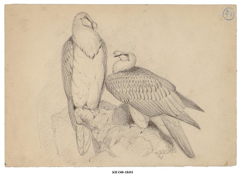 На листе горизонтального формата изображены два бородача. Слева изображен в фас сидящий на уступе скалы бородач, его голова повернута в три четверти направо. Справа чуть ниже на скальном выступе стоит вторая птица, изображенная в профиль налево.