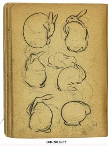На листе вертикального формата - 5 линейных силуэтных набросков кроликов и 2 незаконченных наброска кролика. На обороте - 7 набросков кроликов в разных позах и ракурсах.