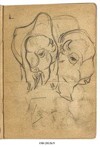 На листе вертикального формата вверху слева - набросок стоящего зубробизона в фас, голова повернута влево. Справа - линейный набросок головы зубробизона в профиль направо. На обороте вверху - линейный набросок передней части зубробизона в профиль направо. Внизу - линейный набросок стоящего и испражняющегося самца зубробизона в профиль направо.
