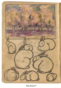 На листе вертикального формата в верхней части в синей рамке изображены осенние деревья с золотистыми кронами, посаженные в регулярном порядке. под деревьями - фиолетовые тени. В нижней части листа - 7 набросков сидящих кроликов в разных позах. На обороте - незаконченный набросок стоящей лошади-тяжеловоза.