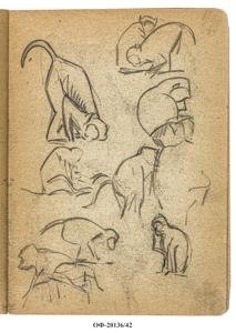 На листе вертикального формата расположены 9 линейных набросков обезьян разных видов (макак и павианов) в различных позах. На обороте - два наброска идущих обезьян, а также зарисовка группы из 5 сидящих, прижавшись друг к другу, макак-резусов.