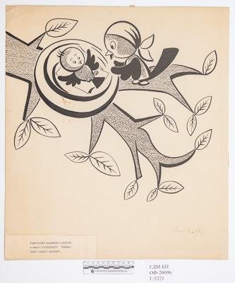 Композиция вертикального формата, изображено стилизованное круглое птичье гнездо на ветке дерева, где на простынке лежит, раскрыв крылья, птенец чижа. Справа перед ним сидит в профиль налево мама-птица в косынке на голове. Все формы рисунка стилизованные, геометризованные.