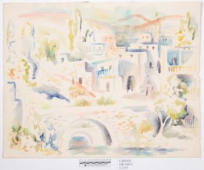 Композиция горизонтального формата, изображен пейзаж Дагестана с селом Чиркей. На первом плане изображен каменный мост с арочным пролетом. На втором плане видны домики с плоскими крышами и балконами среди зелени. Вдали видны розовые горы, возвышающиеся над селом.