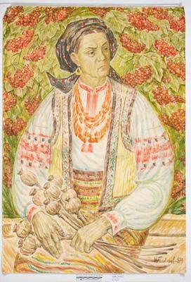 Композиция вертикального формата, основная колористическая гамма - теплая. Поясной портрет сидящей пожилой женщины в праздничном украинском народном костюме. Голова повернута в три четверти направо, на голове повязана черная в красный горошек косынка. Варвара Владимировна одета в белую рубаху-вышиванку с красными узорами вокруг горловины и на рукавах, пеструю полосатую юбку и жупан - жакет без рукавов. На шее - красные коралловые бусы. В руках она держит сухие коробочки мака на длинных стеблях - символ скорби по умершему. Женщина изображена на фоне многочисленных красных ягод и листьев калины - символа бессмертия рода.