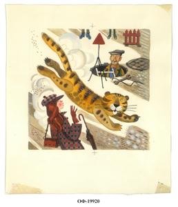 Композиция вертикального формата, изображен стилизованный тигр, стремительно бегущий по улице - все его лапы находятся в воздухе. Слева внизу изображена отпрянувшая девушка в клетчатом пальто и кепи, роняющая зонтик. Справа вверху из открытого канализационного люка выглядывает рабочий в кепке и желтой куртке.