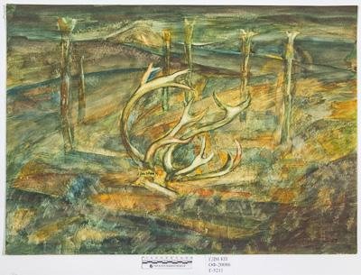 Композиция горизонтального формата, изображен пасмурный пейзаж Камчатки. На первом плане на земле лежат оленьи рога и стоят вертикально вкопанные палки с развилками на конце. На заднем плане видны остроконечные горы и пасмурное небо над ними.