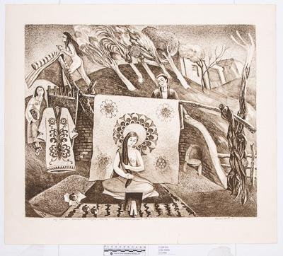 На листе горизонтального формата изображен весенний пейзаж. На первом плане на фоне ковра, перекинутого через балку сидит девушка с длинными волосами и обнаженной грудью пред зеркалом, рядом три граната. Слева висит расшитый халат, идёт одетая девушка, вдали бежит обнаженная девушка с птицей в руке. На дальнем плане одноэтажные постройки и наклоненные влево деревья. Юноша смотрит на девушку с зеркалом из-за ковра. Справа ствол засохшего дерева.