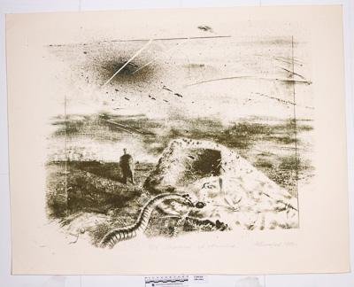 На листе горизонтального формата на первом плане извивается червеобразное существо или труба. На первом плане в земляном холме черное прямоугольное отверстие входа в пещеру. Слева от холма спиной к зрителю стоит коренастый мужчина и смотрит в даль. Линия горизонта расположена в нижней трети листа. Абстрактный пейзаж состоит из темных и светлых полос и пятен.