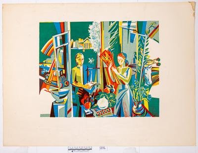 На листе горизонтального формата стилизованная композиция в ярких контрастных тонах разделенная вертикально на три части. В центре изображена две девушки, одна с книгой, вторая со снопом колосьев. На первом плане перед ними стол с овощами и фруктами. За девушкой с книгой виден пейзаж со зданием Академии. За девушкой со снопом голова лошади, далее полевой пейзаж, справа внизу ваза с цветами. Слева за раскрытым окном стилизованный пейзаж с трактором.