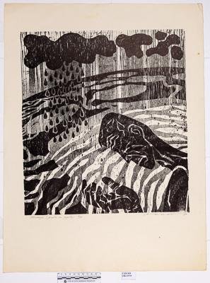 На листе вертикального формата стилизованное изображение воды, дождевых облаков. В правом нижнем углу изображен мужчина в профиль с опущенной головой. Он смотрит на своюладонь.