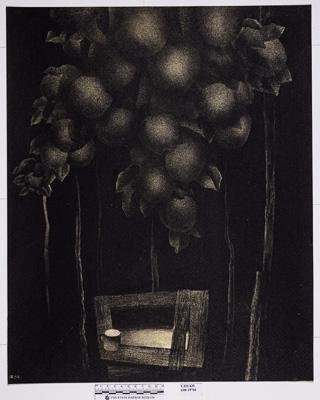 На листе вертикального формата стилизованное изображение: в верхней части композиции изображено множество крупных яблок с листвой. В нижней части композиции в центре изображен деревянный сруб колодца, на верхней планке которого стоит кружка. От колодца к яблокам тянутся кисти тонких корявых веток.